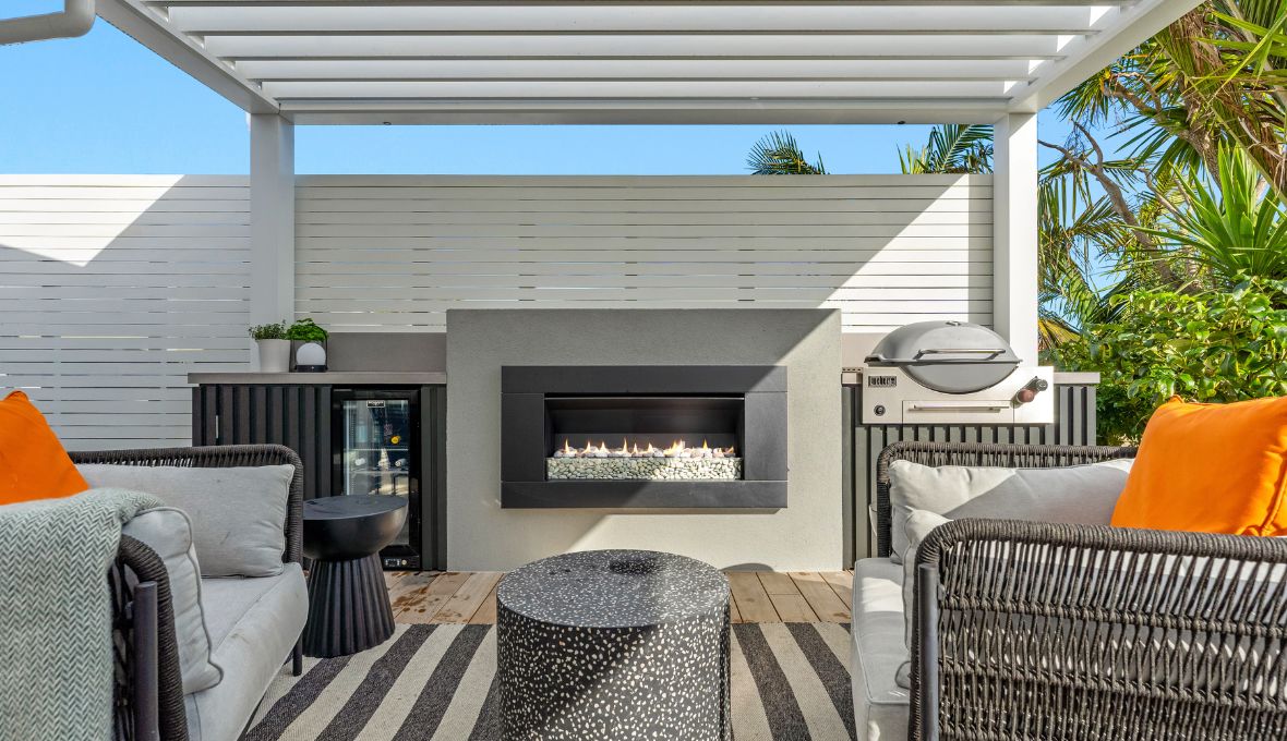 The final design included a decked outdoor room with an automated louvre system, allowing flexible control over light and weather protection. A gas fireplace was added to ensure the space could be comfortably used during cooler months, while a custom outdoor kitchen made the area ideal for entertaining.