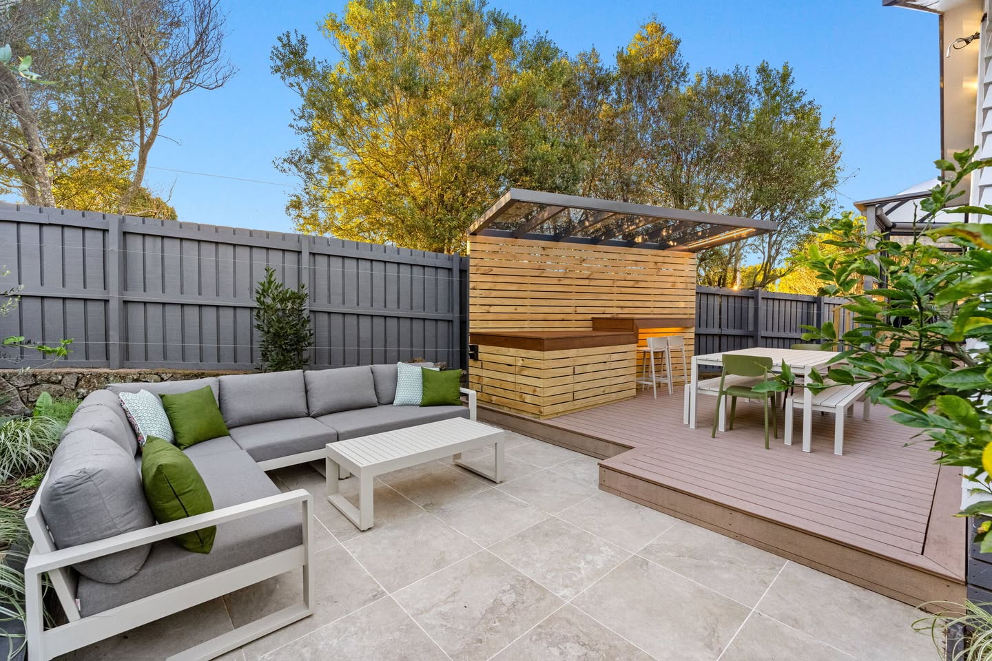 - Timber or composite decking for warmth and texture